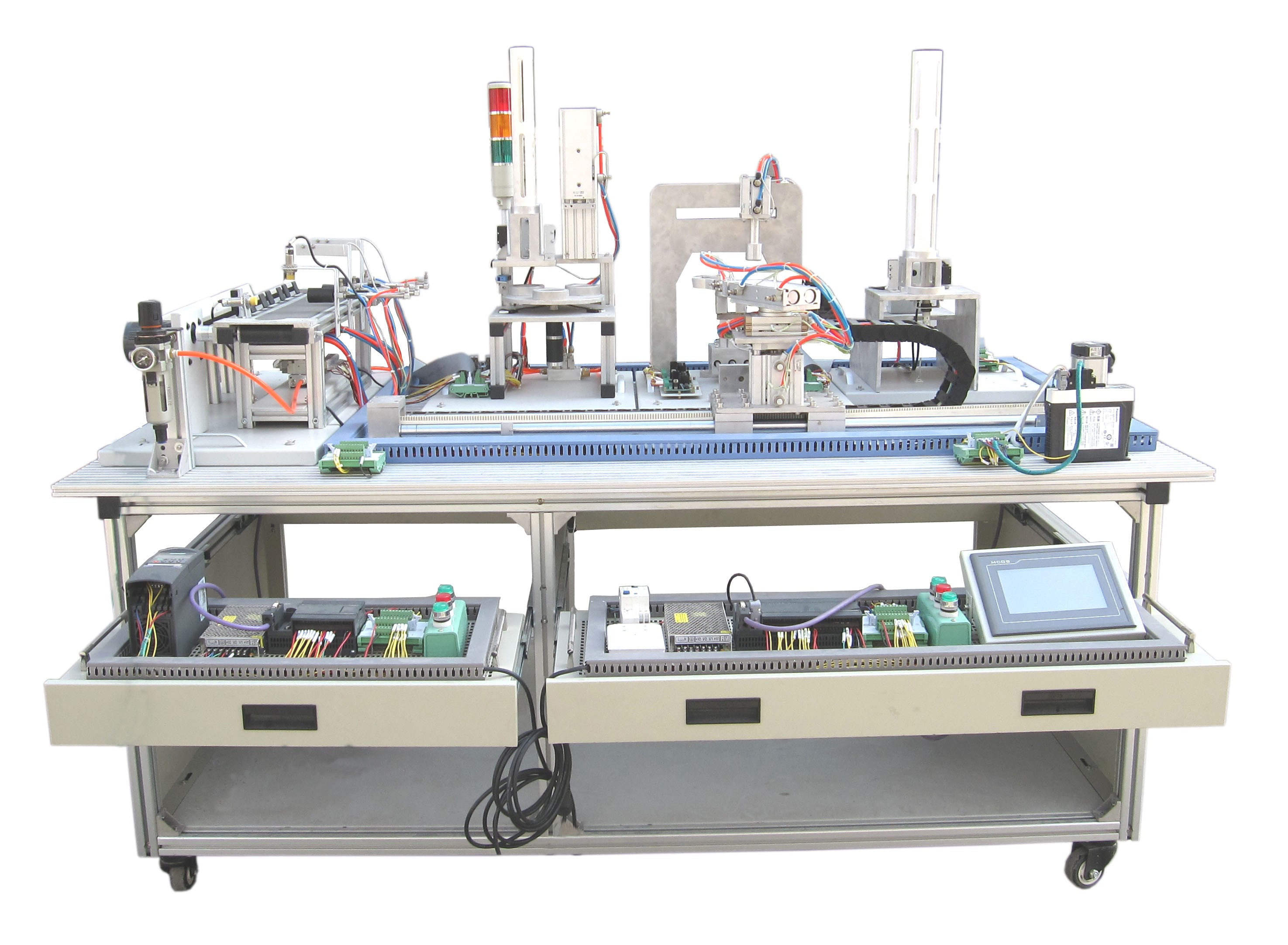 機電一體化技術(shù)實訓(xùn)設(shè)備是指機械技術(shù)、電工電子技術(shù)、微電子技術(shù)、信息技術(shù)、傳感器技術(shù)、接口技術(shù)、信號變換技術(shù)等多種技術(shù)進行有機地結(jié)合,并綜合應(yīng)用到實際中去的技能實訓(xùn)綜合技術(shù),現(xiàn)代化的自動生產(chǎn)設(shè)備幾乎可以說都是機電一體化的設(shè)備。自動化生產(chǎn)線實訓(xùn)考核系統(tǒng),可以培養(yǎng)和提高學(xué)生專業(yè)綜合能力,是一種重要的實訓(xùn)設(shè)備。自動化生產(chǎn)線實訓(xùn)系統(tǒng)、基于PLC技術(shù)的自動化生產(chǎn)線實訓(xùn)考核系統(tǒng),可以培養(yǎng)和提高學(xué)生專業(yè)綜合能力,是一種重要的實訓(xùn)設(shè)備。自動化生產(chǎn)線實訓(xùn)系統(tǒng)整體包括自動供料、檢測傳輸、檢測加工、自動裝配、自動分揀等工序,很好的將機械技術(shù)、微電子技術(shù)、電工電子技術(shù)、傳感測試技術(shù)、接口技術(shù)、信息變換技術(shù)、網(wǎng).絡(luò)通信技術(shù)等多種技術(shù)有機地結(jié)合。該系統(tǒng)中自動分揀站的設(shè)計過程,包括系統(tǒng)硬件設(shè)計、PLC控制設(shè)計和程序設(shè)計方法,F(xiàn)代化的自動生產(chǎn)設(shè)備的最大特點是它的綜合性和系統(tǒng)性,在這里,機械技術(shù)、微電子技術(shù)、電工電子技術(shù)、傳感測試技術(shù)、接口技術(shù)、信息變換技術(shù)、網(wǎng)絡(luò)通信技術(shù)等多種技術(shù)有機地結(jié)合,并綜合應(yīng)用到生產(chǎn)設(shè)備中:而系統(tǒng)性指的是,生產(chǎn)線的傳感檢測、傳輸與處理、控制、執(zhí)行與驅(qū)動等機構(gòu)在微處理單元的控制下協(xié)調(diào)有序地工作,有機地融合在一起?删幊绦蚩刂破(PLC)以其高抗干擾能力、高可靠性、高性能價格比且編程簡單而廣泛地應(yīng)用在現(xiàn)代化的自動生產(chǎn)設(shè)備中,擔(dān)負著生產(chǎn)線的大腦一微 處理單元的角色。因此,培養(yǎng)掌握機電一體化技術(shù),掌握PLC技術(shù)及PLC網(wǎng)絡(luò)技術(shù)的技術(shù)人材是當(dāng)務(wù)之急。而一套基于PLC技術(shù)的自動化生產(chǎn)線實訓(xùn)考核設(shè)備可以模擬一個與實際生產(chǎn)情況+分接近的控制過程,使學(xué)習(xí)者得到一個非常接近于實際的教學(xué)設(shè)備環(huán)境,從而縮短了理論教學(xué)與實際應(yīng)用之間的距離。自動分揀站需完成對上一單元送來的已加工、裝配的工件進行分揀。使不同顏色的工件從不同的料槽分流的功能。當(dāng)輸送站送來工件放到傳送帶上并為入料口光電傳感器檢測到時,即啟動變頻器,工件開始送入分揀區(qū)進行分揀。上海碩博弘揚大國工匠精神, 發(fā)展職業(yè)教育,應(yīng)用教學(xué)設(shè)備,為企業(yè)培養(yǎng)高技能人才,而專業(yè)生產(chǎn):光機電一體化(自動生產(chǎn)線)實訓(xùn)裝置、灌裝自動化生產(chǎn)線實訓(xùn)裝置、工業(yè)自動生產(chǎn)線實訓(xùn)裝置 、工業(yè)控制模擬實訓(xùn)裝置 、機電一體化組合實訓(xùn)平臺 、機電一體化綜合實訓(xùn)考核裝置、自動化生產(chǎn)安裝與調(diào)試實訓(xùn)裝置 、光機電一體化高速分揀實訓(xùn)系統(tǒng) 、典型機電設(shè)備安裝與控制實訓(xùn)裝置、模塊式柔性自動環(huán)形生產(chǎn)線實驗系統(tǒng)(帶機器人工程型)、立體停車庫實物教學(xué)實驗裝置、機電一體化柔性生產(chǎn)線加工實訓(xùn)系統(tǒng)(5站)、網(wǎng)絡(luò)型模塊式柔性自動化生產(chǎn)線實驗系統(tǒng)、模塊式柔性自動環(huán)形生產(chǎn)線實驗系統(tǒng)(工程型)、柔性生產(chǎn)制造實驗系統(tǒng)(工程型)、現(xiàn)代物流倉儲自動化實驗系統(tǒng)、運動實訓(xùn)裝置、循環(huán)搬運自動控制實訓(xùn)裝置、平面雙軸運行控制實訓(xùn)裝置、工業(yè)機械手實訓(xùn)裝置、物料分揀實訓(xùn)裝置、機械手實訓(xùn)裝置 、立體倉庫實訓(xùn)裝置、十字路口交通燈實訓(xùn)系統(tǒng)、機電液氣一體化綜合實訓(xùn)裝置、光機電一體化高速分揀實訓(xùn)系統(tǒng)、步進伺服控制綜合實訓(xùn)平臺、光機電氣一體化控制實訓(xùn)系統(tǒng)、 光機電一體化綜合實訓(xùn)考核裝置、光機電一體化實訓(xùn)考核裝置、光機電一體化實訓(xùn)考核裝置、光機電氣一體化控制實訓(xùn)系統(tǒng)、自動生產(chǎn)線拆裝與調(diào)試實訓(xùn)裝置、柔性自動化生產(chǎn)線實訓(xùn)系統(tǒng)。