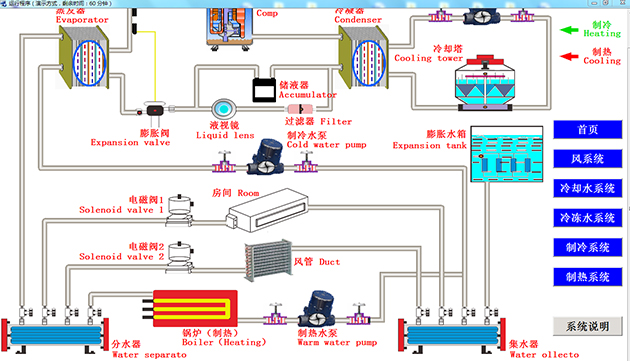 (2)、是系統(tǒng)動(dòng)畫演示:如壓縮機(jī)系統(tǒng)、制冷系統(tǒng)、制熱系統(tǒng)、風(fēng)系統(tǒng)、集中送風(fēng)系統(tǒng)、半集中送風(fēng)系統(tǒng)的原理過(guò)程。