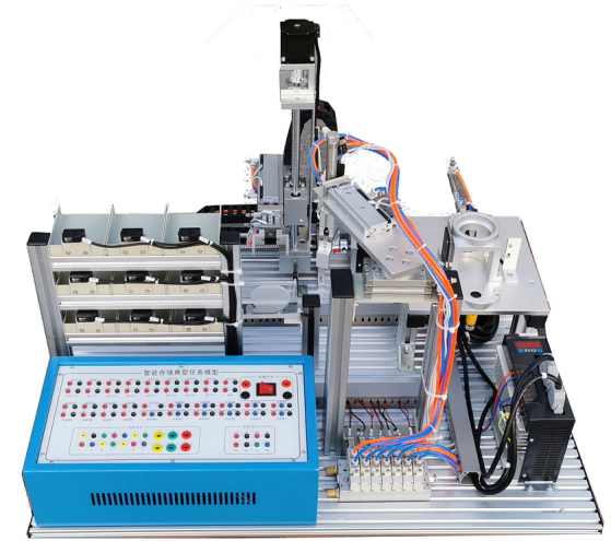 模型底板由10mm厚鋁板加工氧化而成,模型由堆垛機、立體倉庫、搬運機械手、稱重加料機構(gòu)、傳感器、氣缸等組成;所有機構(gòu)由有1.2mm優(yōu)質(zhì)鋼板加工噴涂制作或鋁材機加氧化而成,堅固耐用。該任務(wù)堆垛機有步進與伺服控制,負責物料的出入倉;機械手負責對物料的加料前后的搬運;稱重加料機構(gòu)對物料進行稱重及加料工作。同時為方便教學,開發(fā)了全開放的任務(wù)接口盒,盒體由1.2mm優(yōu)質(zhì)鋼板加工噴涂制作,面板有鋁板噴涂蝕印沖孔而成,通過并口電纜與智能存儲任務(wù)模型連接,以迭插端子形式開放模型接口,方便實訓(xùn)教學。