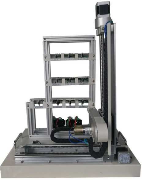 模型包含三層九倉(cāng)位庫體、出/入庫倉(cāng)位庫體、三維(X、Y、Z)運(yùn)動(dòng)機(jī)械及電氣控制等部分組成;定位執(zhí)行機(jī)構(gòu)由豎軸和橫軸組成;驅(qū)動(dòng)機(jī)構(gòu)由步進(jìn)電機(jī)及步進(jìn)電機(jī)驅(qū)動(dòng)器組成;傳動(dòng)軸為滾珠絲桿傳動(dòng)和雙軸導(dǎo)軌帶傳動(dòng),傳動(dòng)平穩(wěn)。取物軸由直流減速電機(jī)驅(qū)動(dòng),可實(shí)現(xiàn)前后兩方向的運(yùn)動(dòng)。 |