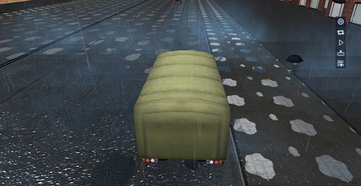 1.1.2 使用汽車動(dòng)力學(xué)仿真數(shù)學(xué)模型,根據(jù)模擬駕駛車輛的質(zhì)量、速度、懸掛性能、摩擦系數(shù)等自身屬性參數(shù)和硬件方向盤的輸入值,以及平原、山地、沙漠等典型地形路面特征信息,結(jié)合硬件解析模塊得到的相關(guān)操作指令(啟動(dòng)、轉(zhuǎn)向、倒車、換檔),實(shí)現(xiàn)模擬車輛駕駛前進(jìn)、倒退、轉(zhuǎn)彎、速度變化、姿態(tài)變化等多種駕駛物理效果;根據(jù)油門、剎車輸入的值結(jié)合當(dāng)前檔位確定縱向加速度,實(shí)現(xiàn)模擬車輛加速、剎車等運(yùn)行效果;根據(jù)車身懸掛系統(tǒng)、運(yùn)行速度結(jié)合地形,實(shí)現(xiàn)模擬車輛運(yùn)行中的顛簸效果和車輛姿態(tài)信息。
