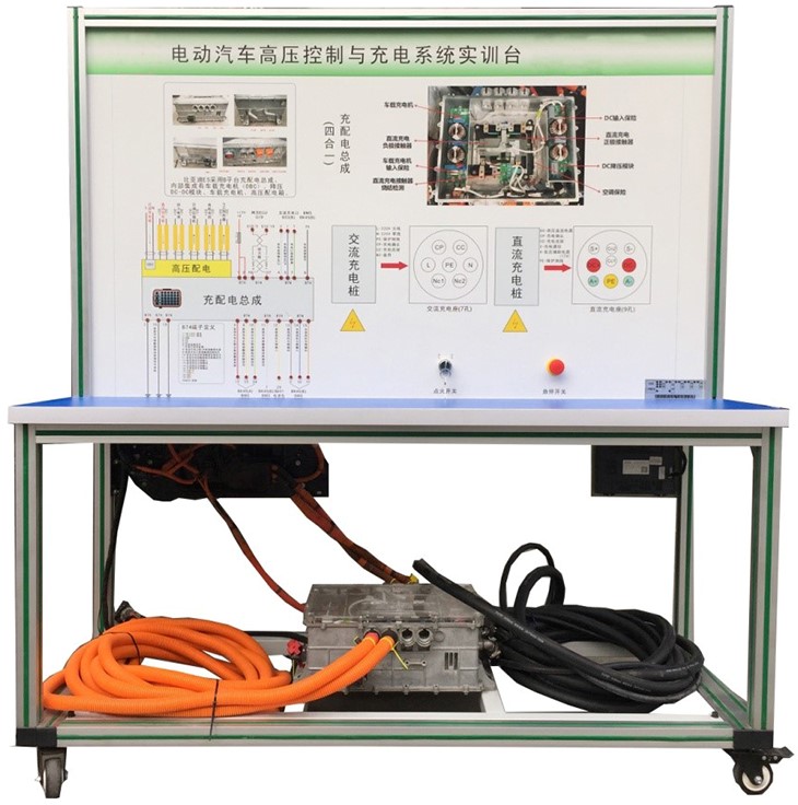 國標(biāo)充電槍與充電座、(北汽EV160純電動汽車)高壓配電箱(帶各類高壓繼電器)、漏電傳感器模塊、絕緣傳感器模塊、安全維修塞模塊、漏電模擬操作單元、高壓安全系統(tǒng)操作單元、操作控制臺、訓(xùn)練控制按鈕、直流接觸器(包含充電繼電器、總正繼電器、總負(fù)繼電器、預(yù)充繼電器)、一體化全鋁合金型材搭建的移動臺架(1500×700×1700mm 帶自鎖腳輪裝置,帶安裝檢測端子的原理面板,面板1448×940mm)、設(shè)備操作說明書。