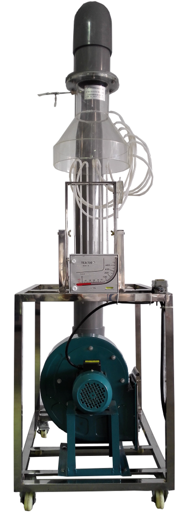 局部抽吸排風(fēng)罩、畢托管、壓差計、低噪音多翼風(fēng)機、管路、斜管微壓計、調(diào)節(jié)風(fēng)門、高度尺、不銹鋼實驗臺架。