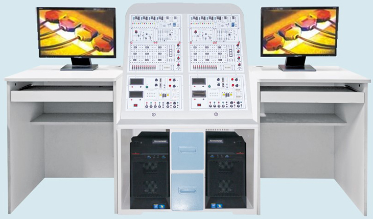 雙工位同步教學平臺:尺寸:800×600×1200mm 材質:ABS 厚度5毫米,平臺后部采用透明有機玻璃;平臺下端兩側擺放電腦主機,主機中間另有兩個抽屜存放實驗器材,平臺上部擺放2個工位的數/模電同步互動教學系統(tǒng)硬件模塊。 |