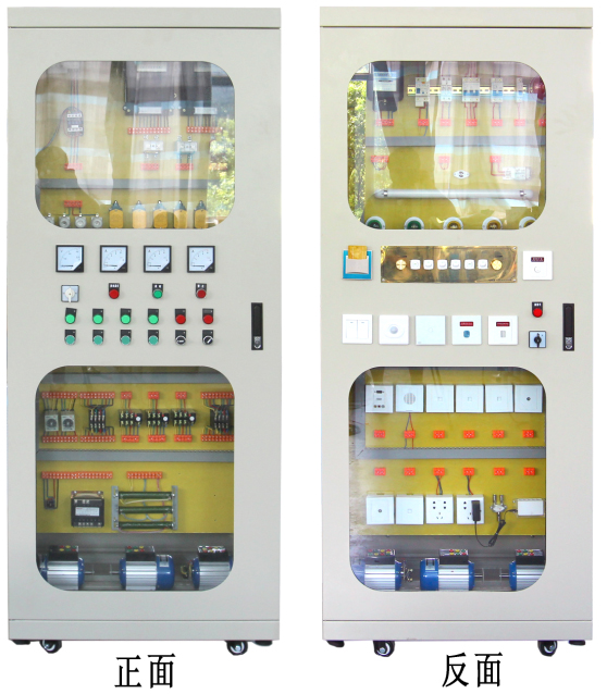 2、電氣柜體正面內(nèi)安裝賓館及公寓內(nèi)部單相電氣控制電路,主要包括賓館客房及公寓住宅全套單相電照明及電器插座模塊(含專用控制面板)同時還配備各種弱電信息模塊。學生通過各種不同的線路連接,既能進行一些諸如請勿打擾電路安裝等小課題的實訓,也能進行一些諸如客房全套電器安裝及故障設置和排除等綜合性課題的實訓。
