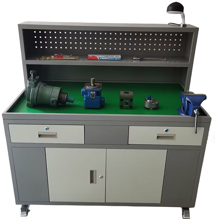 6、實(shí)訓(xùn)臺(tái):采用鈑金結(jié)構(gòu)設(shè)計(jì),表面為雙層亞光密紋噴塑工藝處理,臺(tái)面采用下凹設(shè)計(jì),增加臺(tái)虎鉗,以及絕緣防滑墊,同時(shí)為液壓閥拆裝時(shí)提供一個(gè)良好的接油、防震平臺(tái)。
