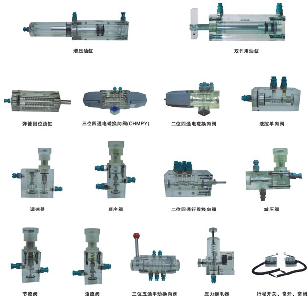 4、實驗元件均為透明有機材料制成,便于了解掌握幾十種常用液壓元件的結(jié)構(gòu),性能及用途。掌握幾十種基本回路的工作原理,實驗組裝回路快捷、方便。